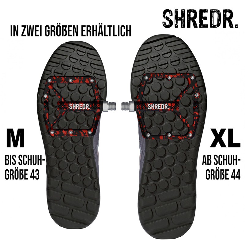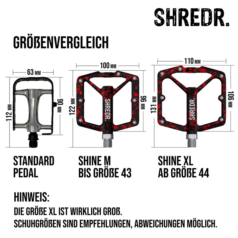 - MATCHING: The SHREDR. Shine pedals are available in two sizes, so you get the right pedal for your shoe size. Medium is suitable up to shoe size 43 and XL from size 43.