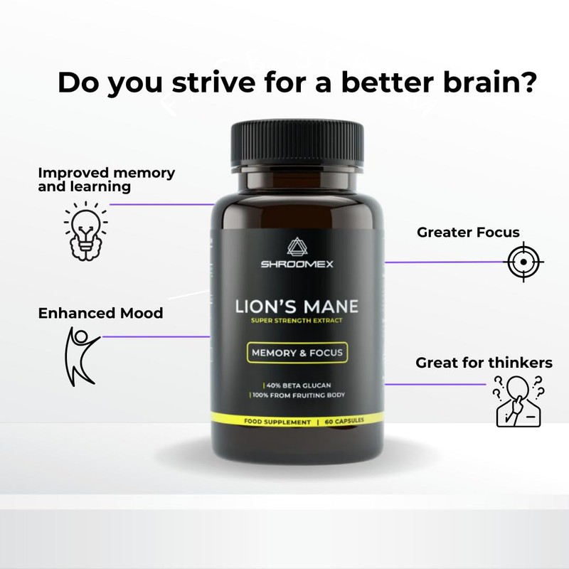 Shroomex Shroomex Lion's Mane Mushroom Capsules C Dual Extract with 50% Beta Glucans | 60 Vegan Capsules | Focus, Memory & Nerve Support | Fruiting Body Only | Lab Tested | UK Made