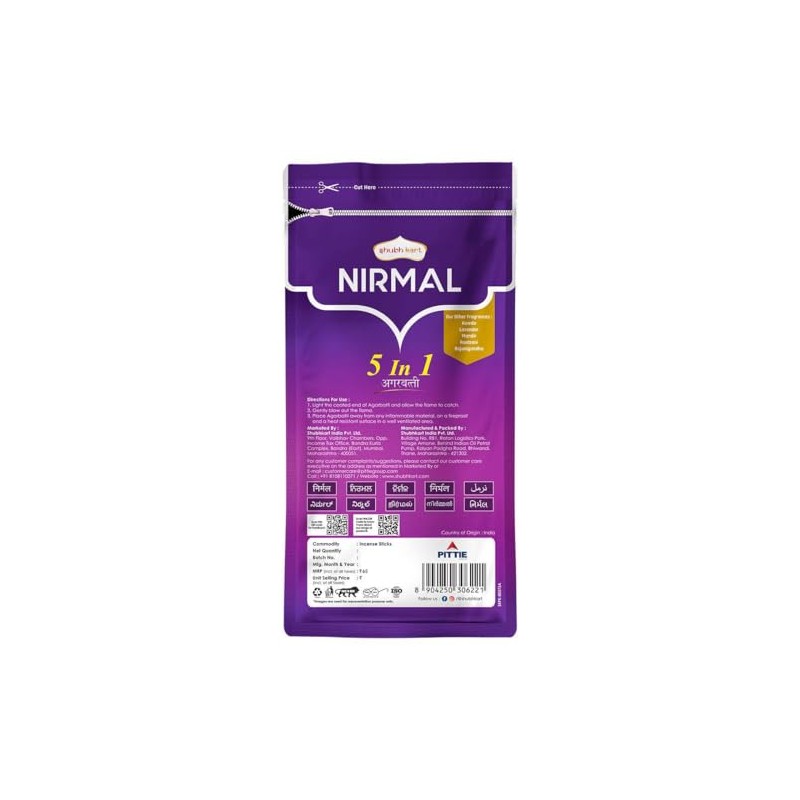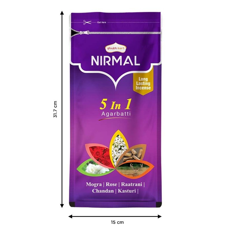 - Shubhkart's Nirmal 5 in 1 Agarbatti Mogra, Rose, Raatrani, Chandan, Kasturi (Pack of 2), each measuring 9 inches, offer a 45 minute burn time. You'll receive 100 incense sticks in each zipper pack, guaranteeing their long-lasting freshness.