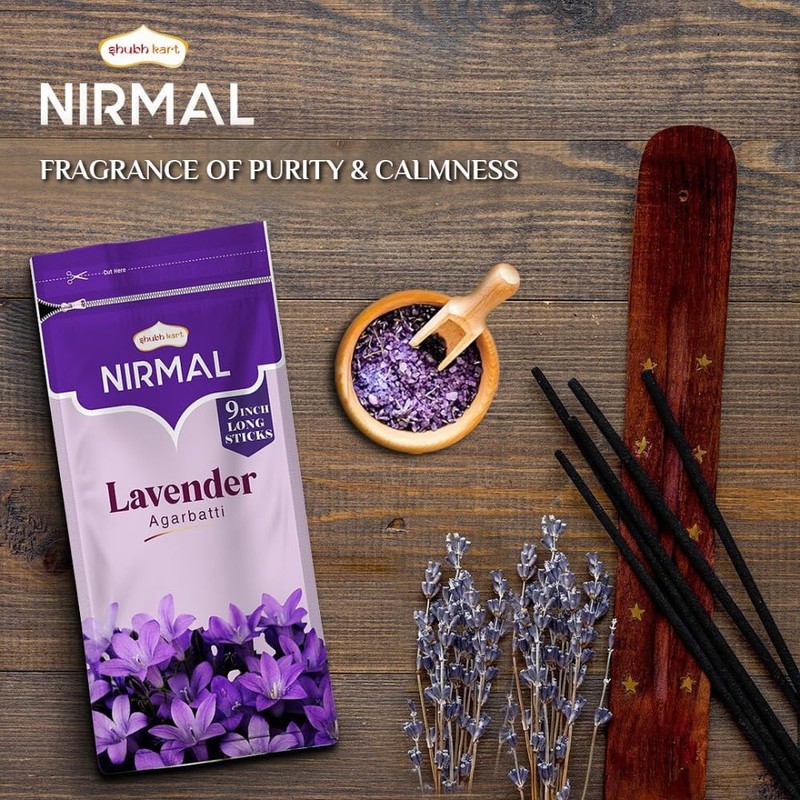 - Shubhkart's Nirmal Lavender Agarbatti (Pack of 2), each measuring 9 inches, offer a 45 minute burn time. You'll receive 100 incense sticks in each zipper pack, guaranteeing their long-lasting freshness.