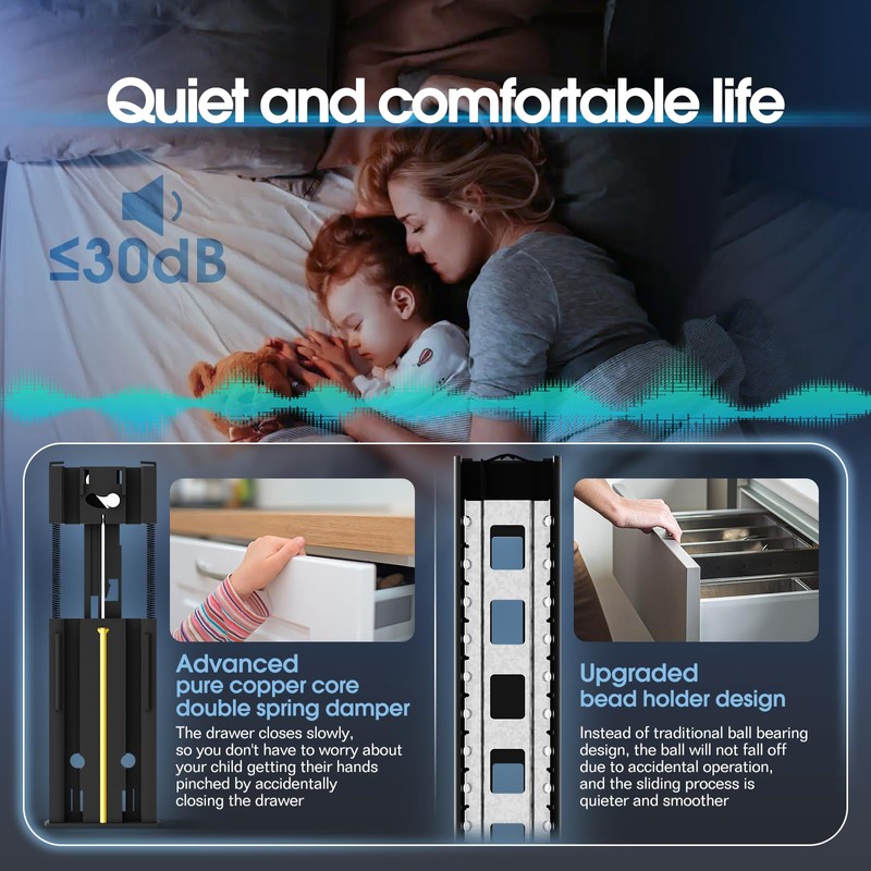 • 【5 Pairs Soft Close Function & Copper Core Double Spring Damping】Soft Close Drawer Slides Allows the drawer to close quietly and gently to avoid sudden slam.Don't worry about kids clipping their hands.Slide rail Ball-bearing design ensure drawer slides smoothly and freely.