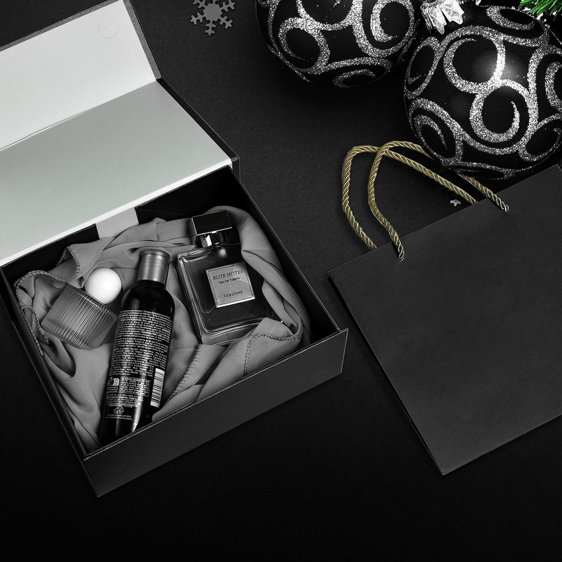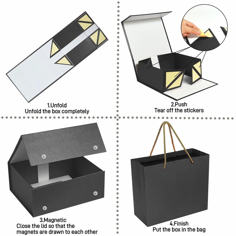 - Simple and Noble Packaging Appearance - Black gift box with gift bag for presents measures size is 9.8x7.9x4 inches, Collapsible gift box can hold chocolates, candies, cosmetics, perfumes, jewelry, candles, cups, souvenirs or smaller clothing accessories and more.