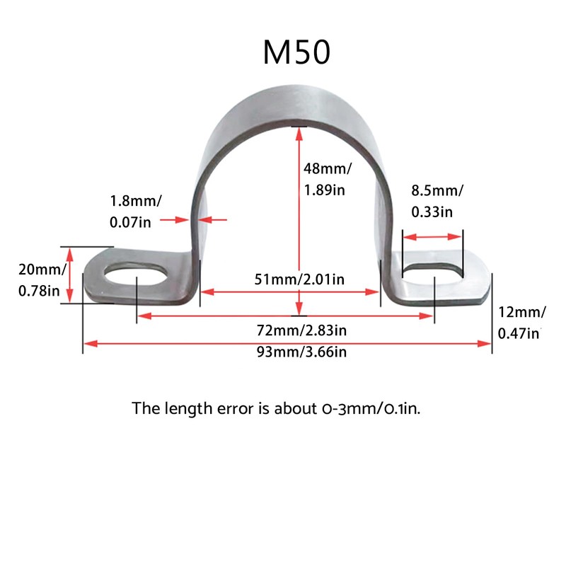 - Size and Compatibility Our U band clamps are designed for tubes with an outer diameter of 50mm (1.96") and thickness of 1.5mm (0.06"). The holes are 72mm (2.83") apart, and each package contains 6 clamps.