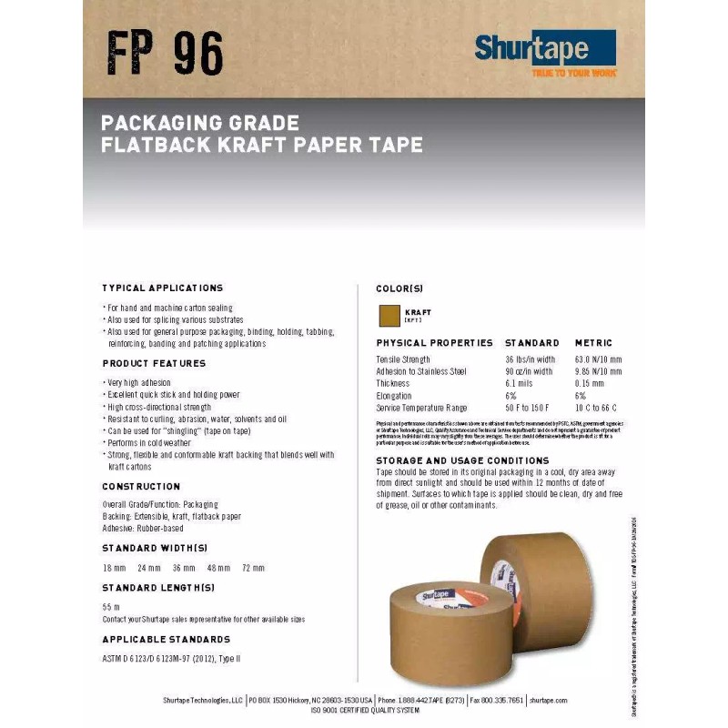 Packaging grade flatback paper tape used for hand and machine carton sealing and splicing, as well as for general purpose packaging, binding, holding, tabbing, reinforcing, banding and patching applications. Strong, flexible and conformable, FP 96 is constructed with an aggressive, rubber-based adhesive that delivers excellent quick stick and holding power, even in cold weather.