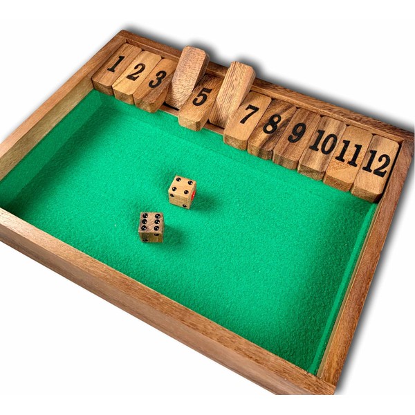 Shut The Box Game appeals to all ages. A wonderful family and educational game, also can be a fun gambling or drinking puzzle game. It is found in bars all over the world, but even more so in schools and often nursing homes too!!. For you teachers and Homeschoolers and game players who want a little more thinking, this 1-12 version offers more opportunity for math challenges. It will do everything the #1-9 version does by flipping up the numbers 10,11,12 and playing it just like a #1-9 box. Bur significantly, you can use multiplication on this #1-12 version! For example, if you roll and 4 and a 5, you can call it either 4 + 5 = 9 (addition) or 4 x 5 = 20 (multiplication). Its best to multiply if you want to do well in the game as you get bigger numbers and can flip more tiles. Now the child must find numbers to add or multiply to 20 if they chose multiplication. More of a challenge.... This particular model from our shop is very nice. All hardwood construction, it focuses on quality with a premium feature of the numbers being burned into the wood, thus are easily cleaned and will easily last the life of the game. This model also has thicker wood in all areas than you will see in other makers boxes. The dice are handmade of the same wood as the game. It is available in RED or BLUE or GREEN.