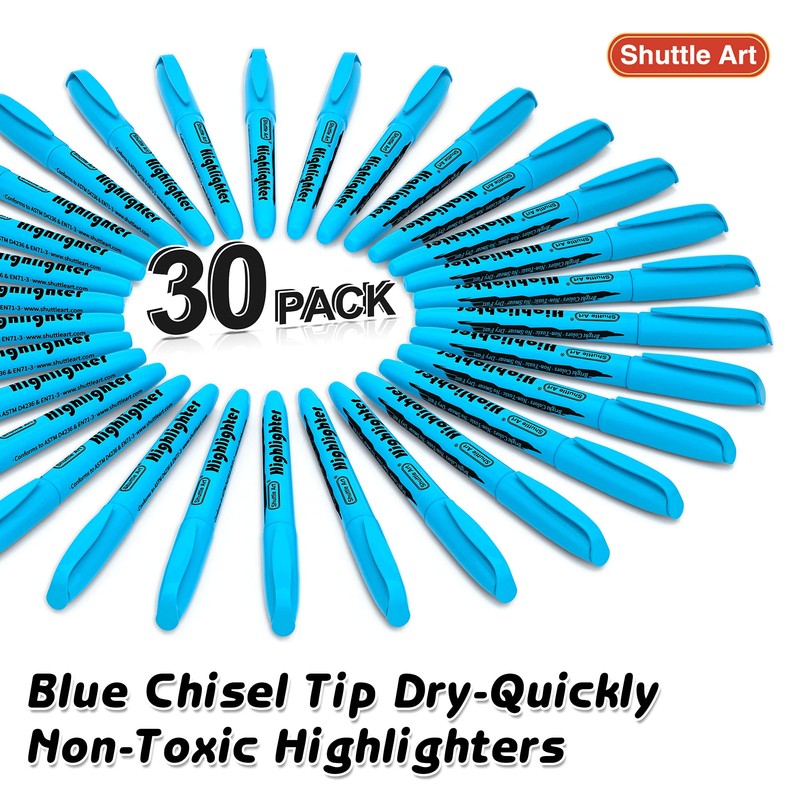 Shuttle Art Highlighters, 30 Pack Blue Highlighters Bright Colours, Chisel Tip Dry-Quickly Non-Toxic Highlighter markers for Adults Kids Highlighting in the Home School Office
