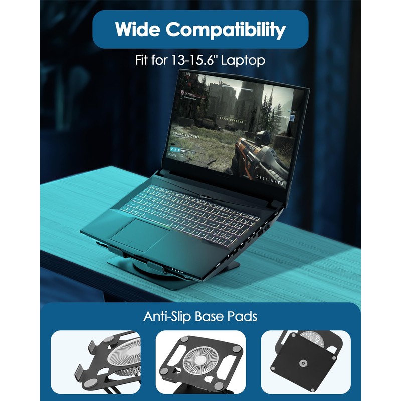 - [Stable Carbon Steel Framework] This laptop cooling stand, weighing 3.68LBS, offers a solid and balanced feel, preventing any tipping or slipping. There are rubbers on the bottom of the base and the top of the stand panel, effectively preventing scratches to the tabletop or laptop.