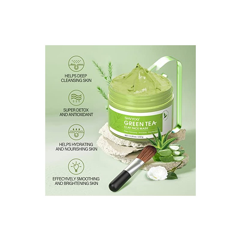 SHVYOG Green Tea Face Mask, Antioxidant Green Tea Clay Mask with Volcanic Mud, Deep Cleansing & Moisturizing & Hydrating Clay Facial Mask for Pores, Blackheads, Wrinkles, Dirts