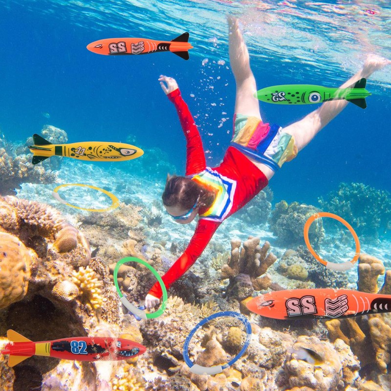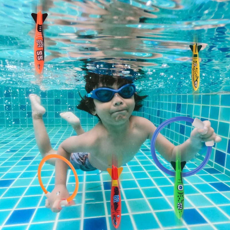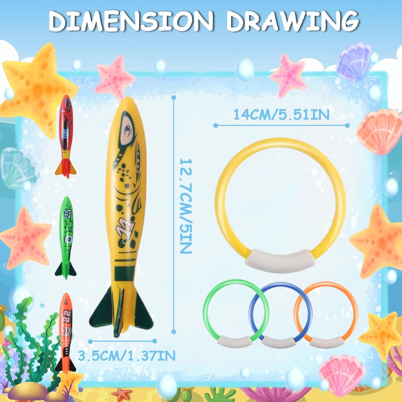 - Diving training design: the diving torpedo has a super streamlined design that can sink quickly and provides an exciting diving experience. The diving ring can stand upright on the bottom of the pool and set targets at different distances. It can not only train children's swimming skills, but also promote the fun of exploring the underwater world. It is the perfect partner for pool training and parent-child games