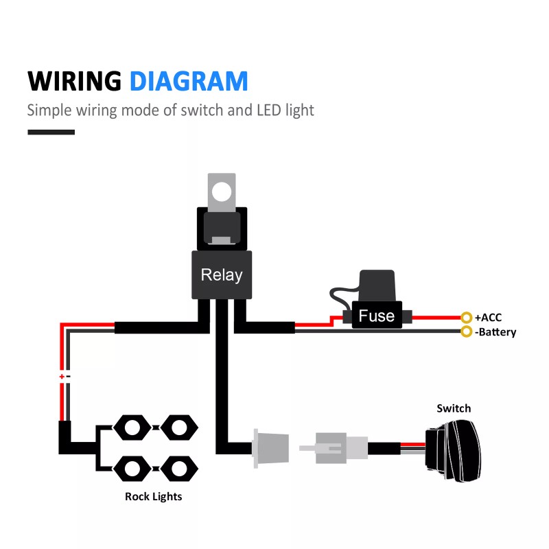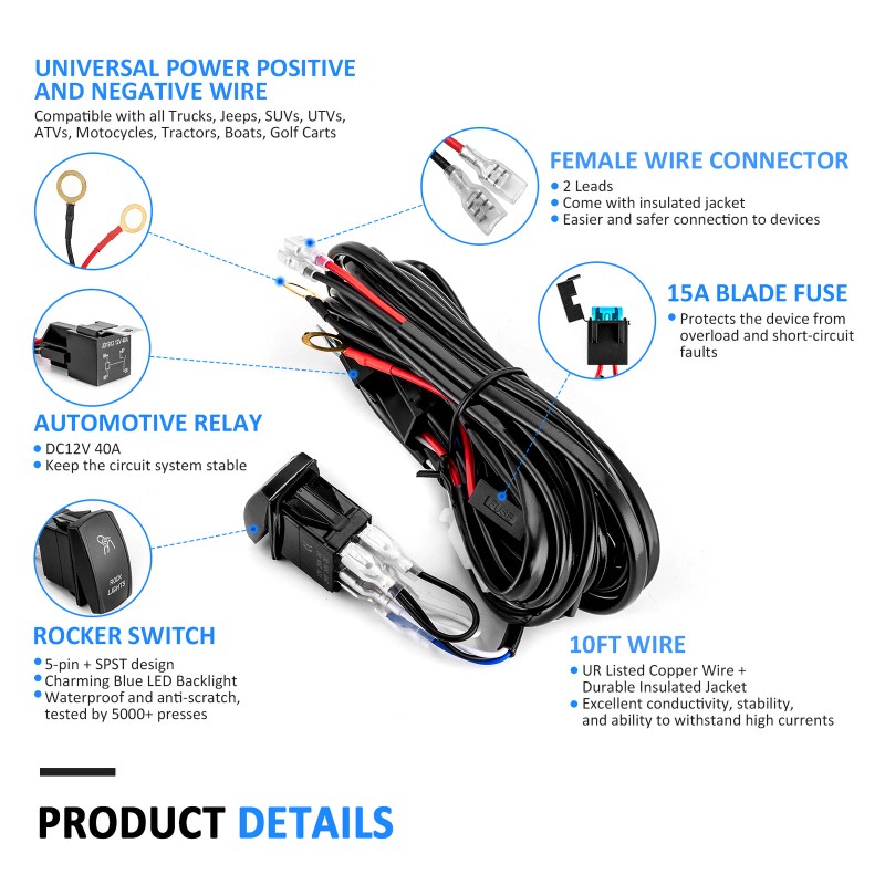 1 x Wiring Harness, Sold As A Whole Set, includes 5 pins ON/OFF Rocker Switch, 10ft wire, inline blade fuse, and automotive relay, No need to purchase separately, saving you valuable time and money.