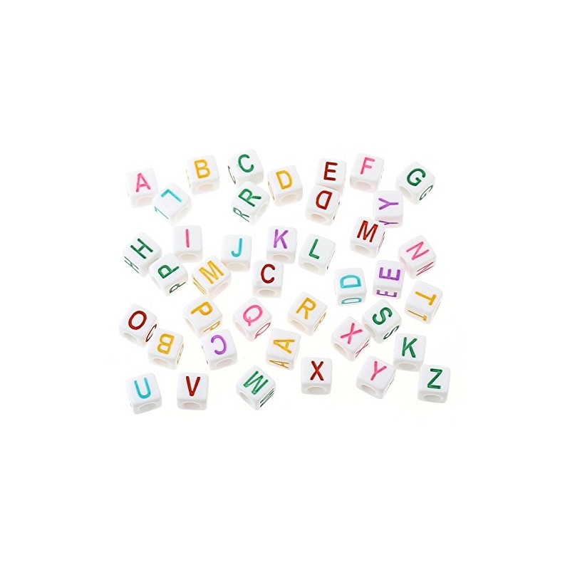 ♥ Colour and shape: the jewellery beads have a white surface and have a colourful lettering. The plastic bead has a square cube shape.