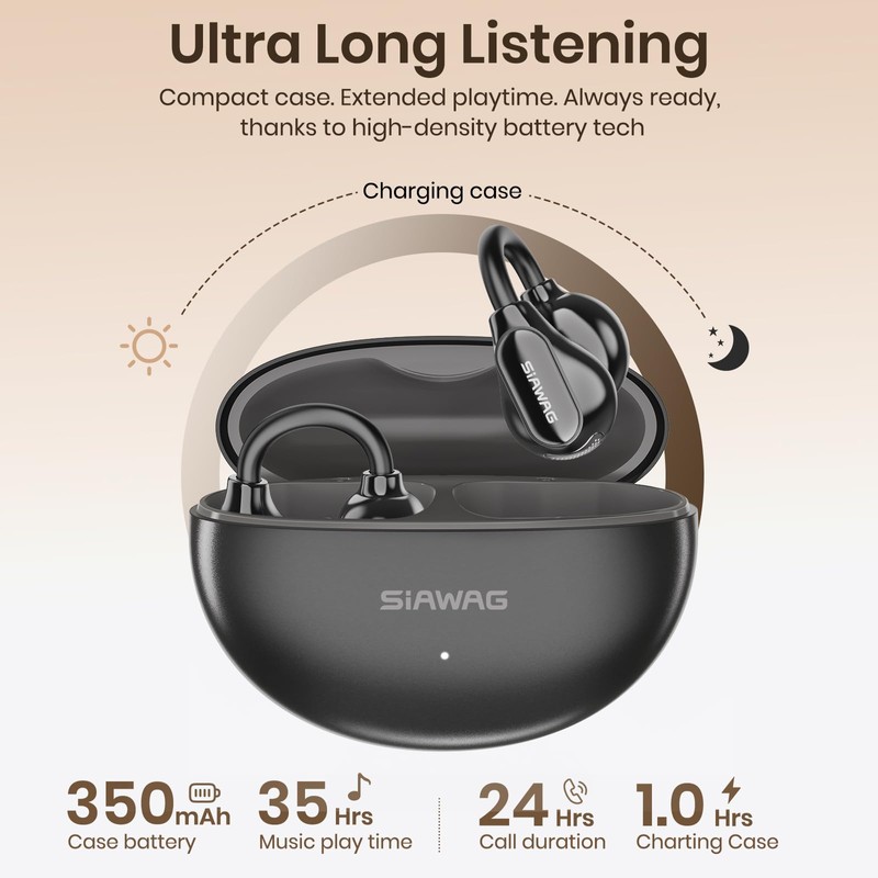 IP5 Waterproof & Dustproof: Built to withstand the elements, the SIAWAG open ear headphones are rated IP5 for waterproof and dustproof. The clip-on earphones support dual pairing function with an in-ear design, allowing for single or dual ear use. Whether you're in the rain or sweating profusely in the gym, your earphones will stay secure and perform at their best.