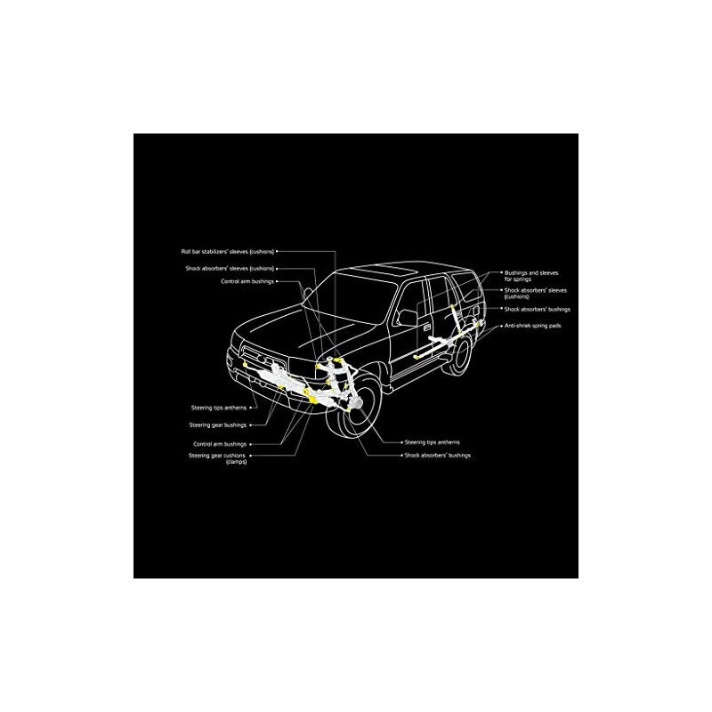 • Manufactured from the best durable polyurethane-based elastomer which increase the service life of the parts, serving your car two-tree times longer than rubber analogues. Siberian Bushing spareparts were tested in the most severe road and weather conditions in the world - in Siberia.