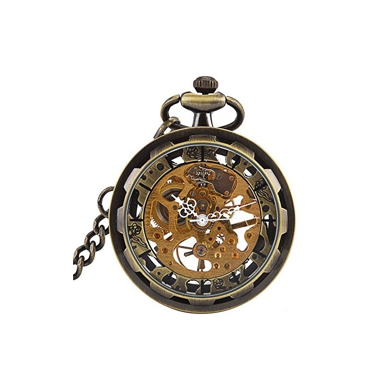 SIBOSUN Open Face Pocket Watch Steampunk Bronze Mens Transparent Skeleton Mechanical Chain + Gift Box