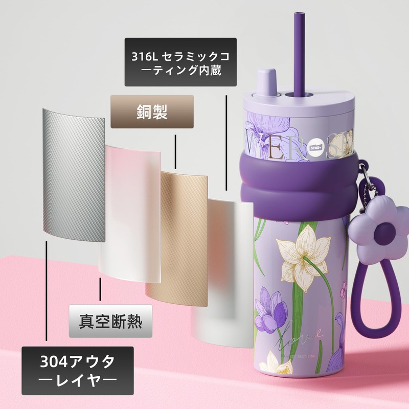 - 使いやすさ:保温ボトルの口は広口なので、飲み物を入れやすく、お手入れも簡単です。回転式のストローキャップが、中のストローをしっかりと保護します。