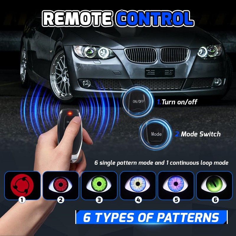 - 【6 Different Eye Patterns】6 single mode and 1 continuous loop mode.Switch between different colors and animated patterns with one click with the remote to show your personality. Devil eye headlights are ideal for adding a unique look to your car.