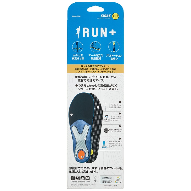 SIDAS 325326103 Cidas Run Plus Size M, 9.8 - 10.4 inches (25.0 - 26.5 cm), Arch Support, Shock Absorption, Grip, Cushioned, Running, Marathon, Run and Field