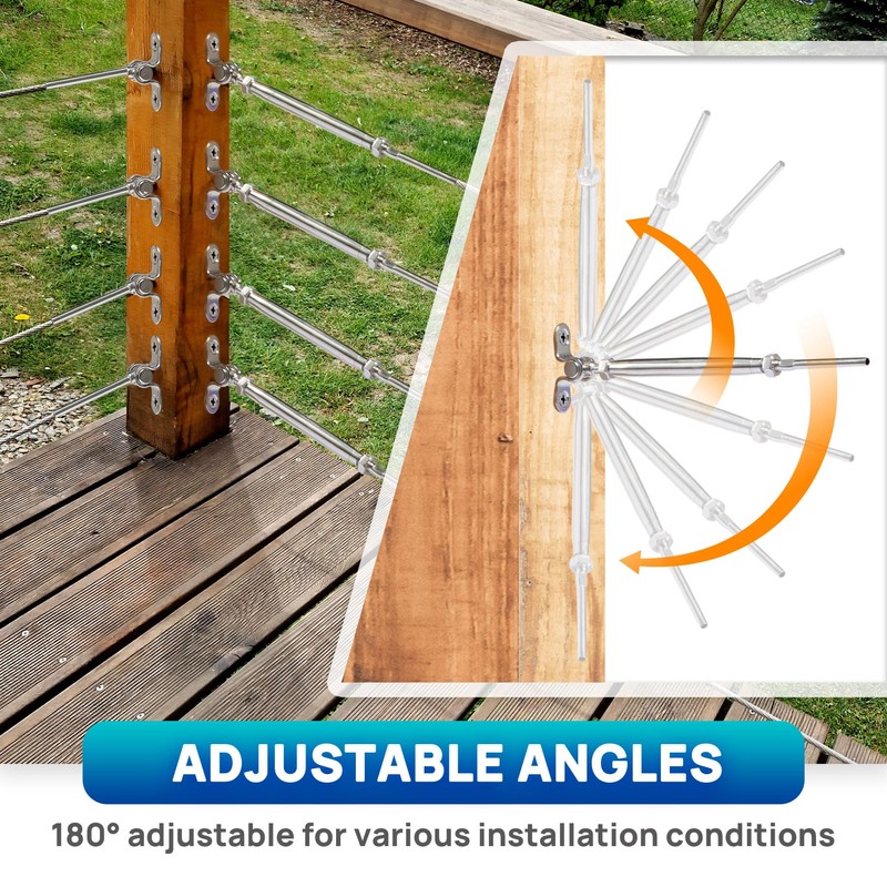 - Flexible angle adjustment: Enjoy the freedom of angle customization with a 180° adjustable base. The turnbuckle can expand up to 10 inches and retract to 7 inches, making it perfect for various angle railings, whether indoors or outdoors
