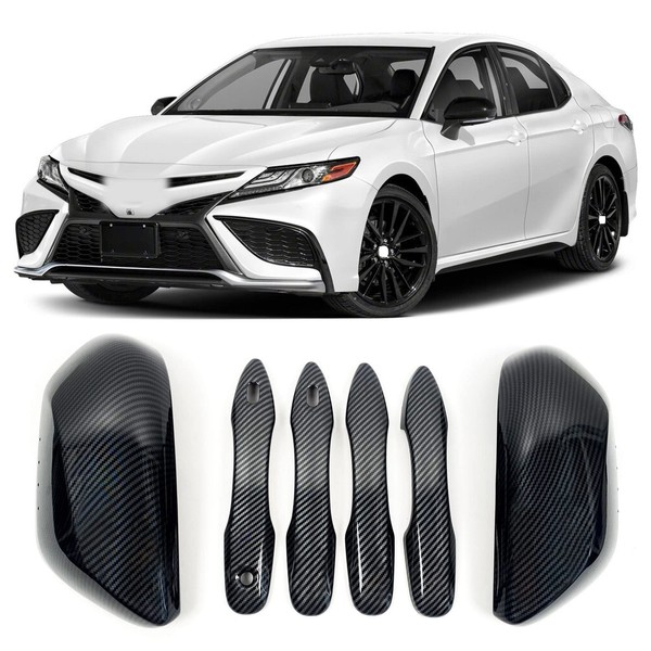 Side Door Mirror Cap Cover Trim + 4 Door Handle Cover Trims Smart Compatible With 2018 2019 2021 2022 2023 2024 2025 Toyota Camry Accessories Rearview Mirrors Caps Cover Overlay Carbon Fiber Style