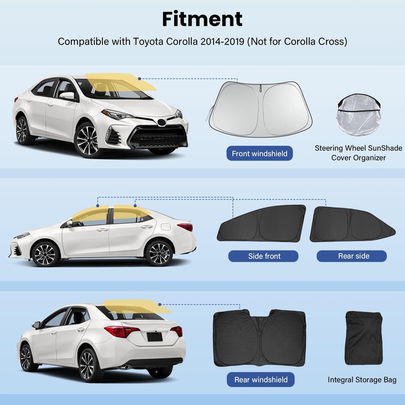 - Vehicle Specific: sun shade custom Compatible with Toyota Corolla 2014-2019 (Not for Corolla Cross). Our window shade is according to the car size design, perfectly fit your car and does not need to trim. windshield sun shade solve the problem of light leakage and incompatibility of the old umbrellas
