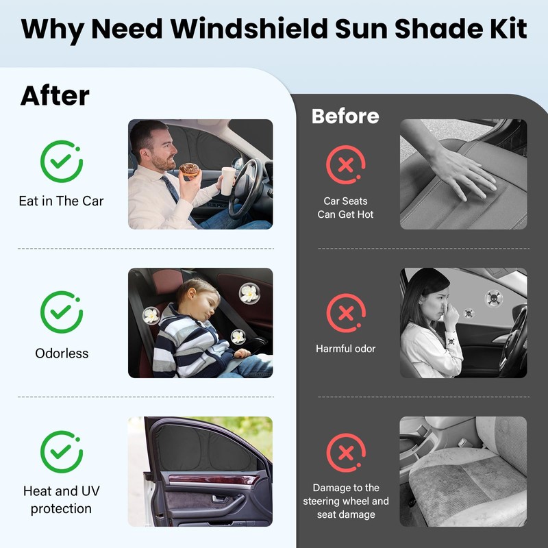 - Upgrade Fabric for Great Protection:The front windshield for Toyota Corolla is made of 2024 upgrade polyester fabric with UV reflective material, two -layer heat insulation and 99% SPF, reducing heat buildup by up to 40°F and blocking 99% of harmful UV rays. Keep your car cooler and prevents leather seats from cracking and fading