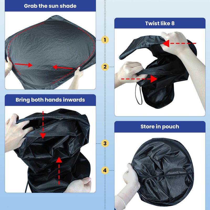 - Sunlight Protection & Keeps Cool:windshield sunshade is made of reflective fabric with UV reflective material, The window shades do a good job of protecting babies and kids from sunshine, also reducing damage the instruments like dashboard and seats etc, you will wait less time and use less energy for your AC to cool off your car before driving. Also, you will reduce the uncomfortable leather smell caused by high temperature, ensuring a longer value of your car and safer life of your families and pets