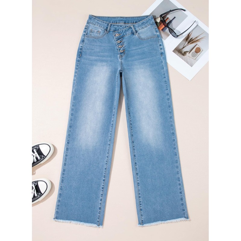 - Features: Trendy jean features crossover waist, wide leg, high waisted, raw hem, button closure, baggy style and basic five pockets design. The raw hem detailing add a touch of rugged charm to your outfit, striking a balance between fashion and casual