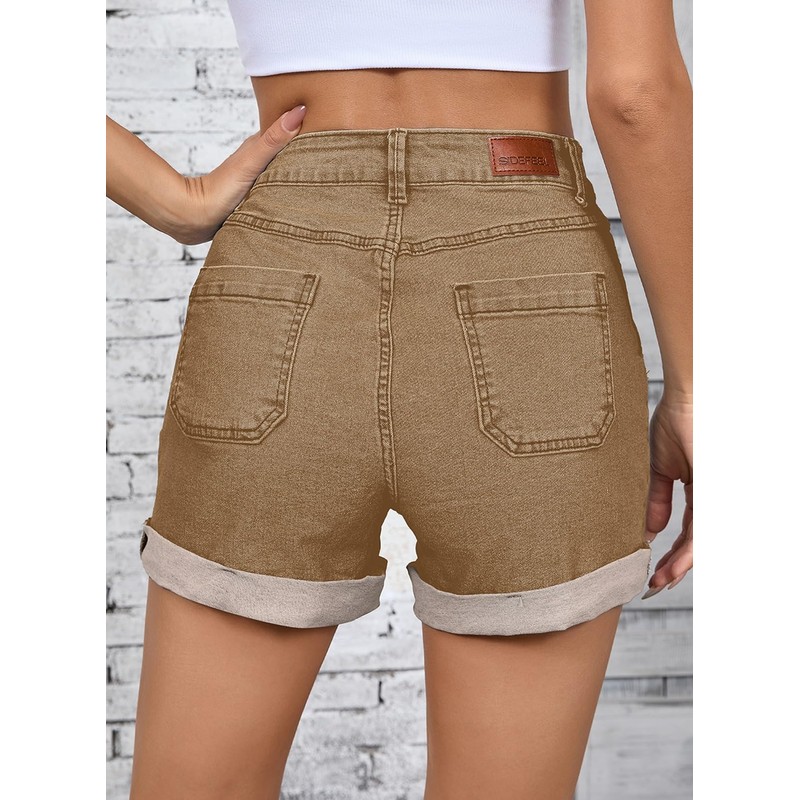Sidefeel Womens Jean Shorts Trendy High Waisted Stretchy Buttoned Folded Hem Jean Shorts Brown Size 4