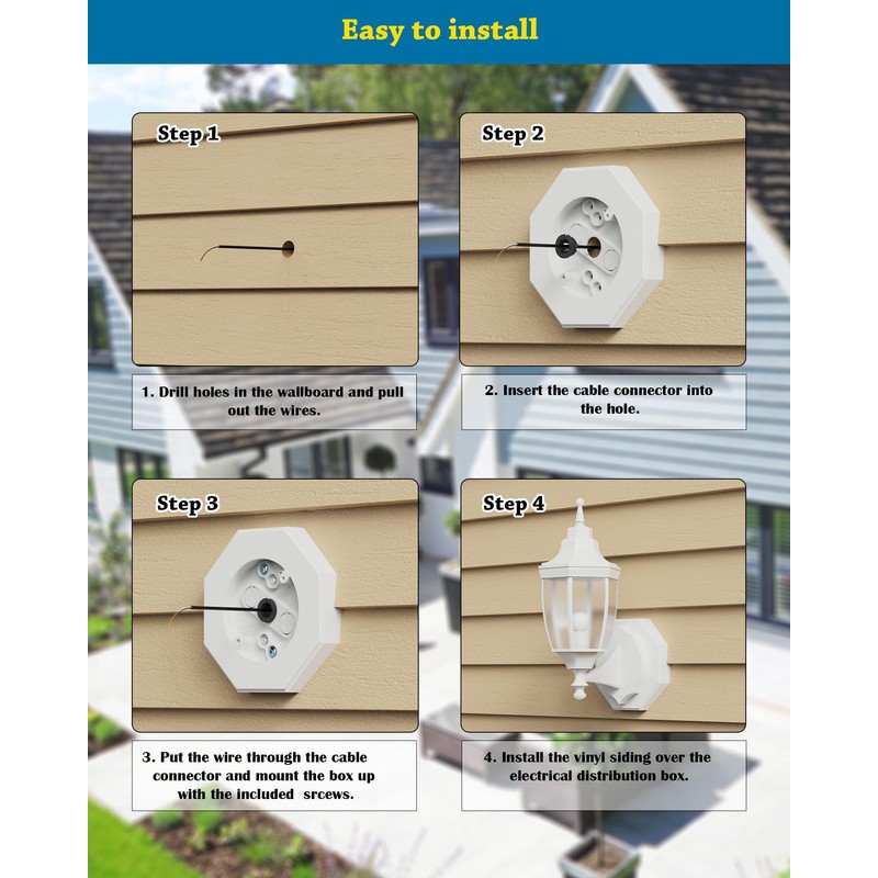 - ✅【Package Included】This package contains a white vinyl siding light mounting block, four mounting screws and a NM cable connector. We attach great importance to customer satisfaction, so you can always rest assured about our service. 【Note】: Caulk can be used for a custom fit around the top of siding mounting kit outdoor light if necessary.
