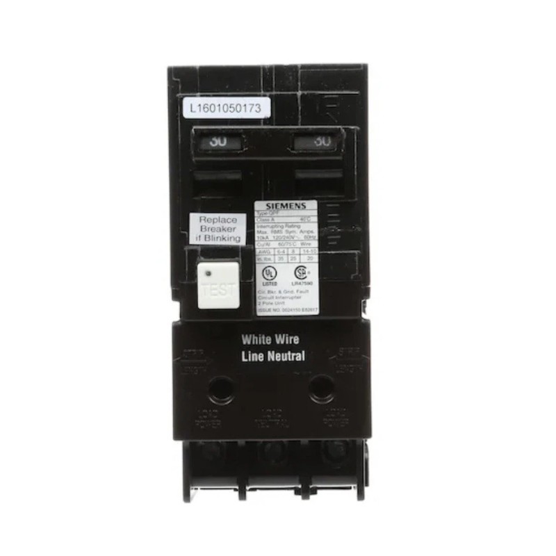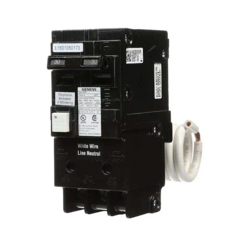 This Siemens QF230AP is a 30A, 240V, 2 poles ground fault circuit interrupter breaker. It is suitable for interior use, particularly for bathroom, kitchen, pools, or spas. This Class A plug-in circuit breaker offers GFCI protection with a pigtail neutral connector. The black-colored unit is made of plastic.