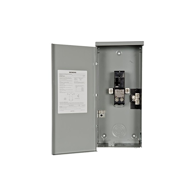 Siemens 200 Amp circuit breaker enclosure includes an outdoor rated enclosure and a QN2200H, 200 Amp, circuit breaker. This panel is ideal as a disconnecting means for a house, building, or piece of equipment.