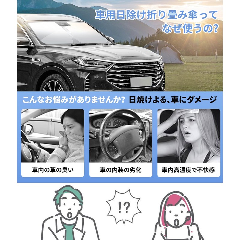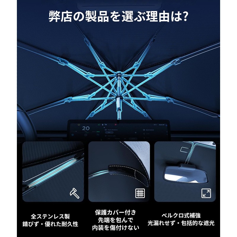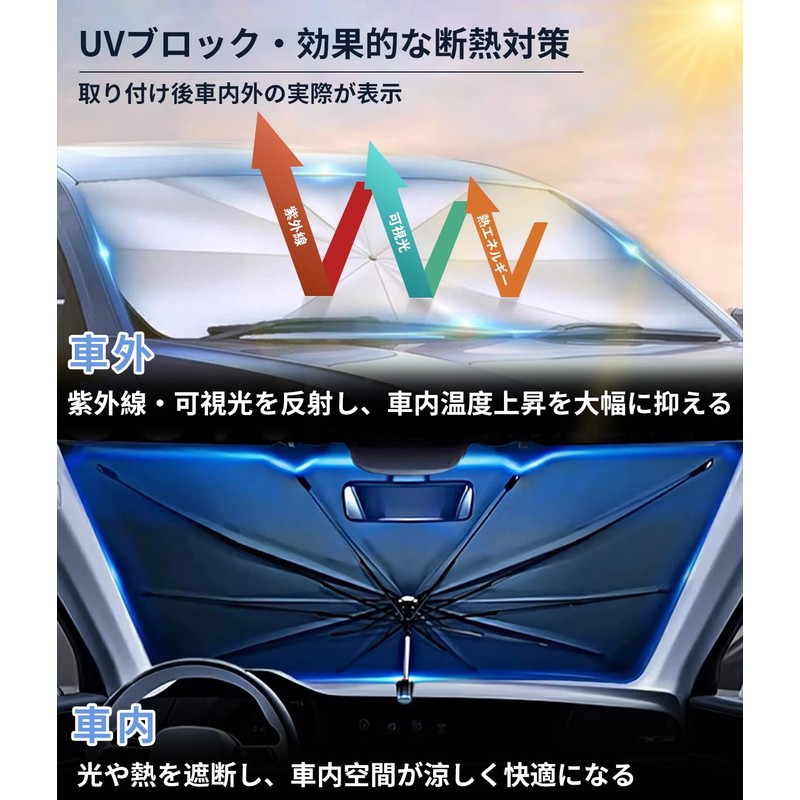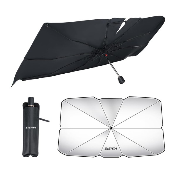 - (Effective heat insulation and cool even in summer) This sunshade umbrella is made of multi-layer insulation material. The silver surface reflects UV rays and heat to prevent sunburn deterioration of your car interior. The black side is made of high quality insulation material that absorbs heat and blocks light from leaking into the car, making your car space cool and comfortable. Even if you park for a long time in summer, you don't have to worry about getting hot when you get back to the car