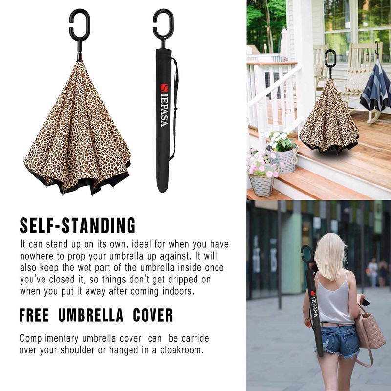 SIEPASA 49/56 Inch Inverted Reverse Upside Down Umbrella, Extra Large Double Canopy Vented Windproof Waterproof Stick Golf Umbrellas with C-shape Handle.(Leopard, 49 Inch)