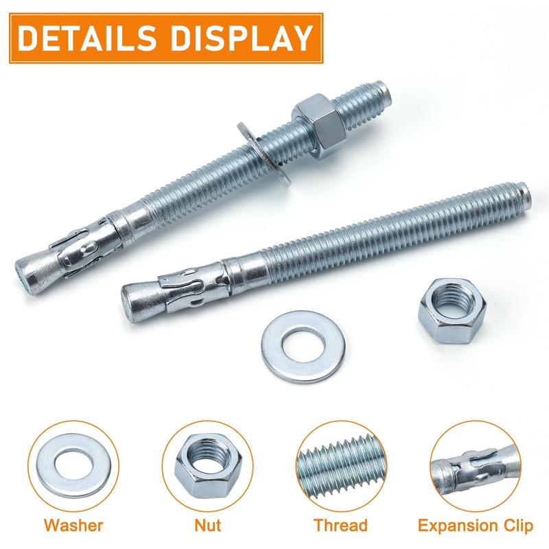 - 【VERSATILE APPLICATIONS】The wedge anchor perfect for securing metal plates (steel/aluminum), wood to concrete. These wedge anchor is ideal for structural anchorage, storage racking anchorage, machinery and hand rails installation.