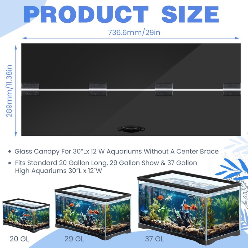 - Size Appropriateness: with the dimensions approximately 29 x 11.38 x 0.12 inch/73.66 x 28.9 x 0.3 cm, it serves as an optimal cover for 20 Gallon Long, 29 Gallon Show, 37 Gallon High Aquariums 30" Long x 12" Wide Aquariums without center brace; This considerable size provides your aquatic pets with the necessary security they need; Please check the product size carefully to ensure it fits your fish tank