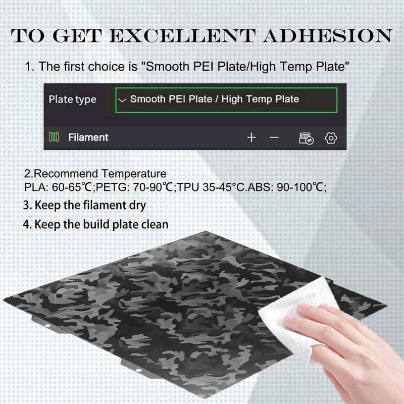 - 【Good Adhesion】The excellent adhesion base on selecting "Smooth PEI Plate/High Temp Plate" on your slice and clean up the spring steel plate before each print. Beside, please use our recommend filaments, PETG: 70~90℃; TPU: 20~40℃; PLA: 60~65℃; ABS: 90~100℃.