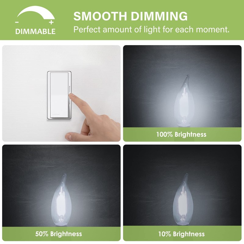 - Excellent Dimming Performance:Dimming feature of LED candelabra bulb is precise and solid from high to low with the latest light source pattern. Our LED candelabra bulb dimmable is tested to be fully compatible with the dimmers without flick, humming or buzzing