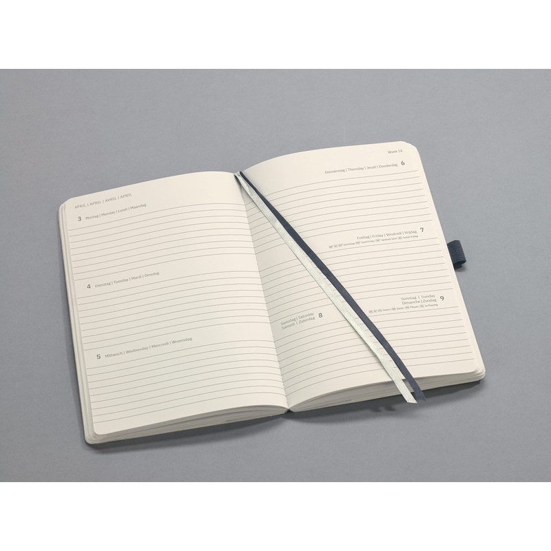 - Chamois-coloured paper (80 gsm, PEFC-certified), printed in classy grey : monthly and annual overview, public holidays (D/AT/CH/UK/FR/BE/NL), overview of school holidays (DE/AT/CH/NL), units of measurement (EU/UK/US), a map of international time zones : elastic fastener, pen loop, quick pocket, archive pocket,two ribbon markers