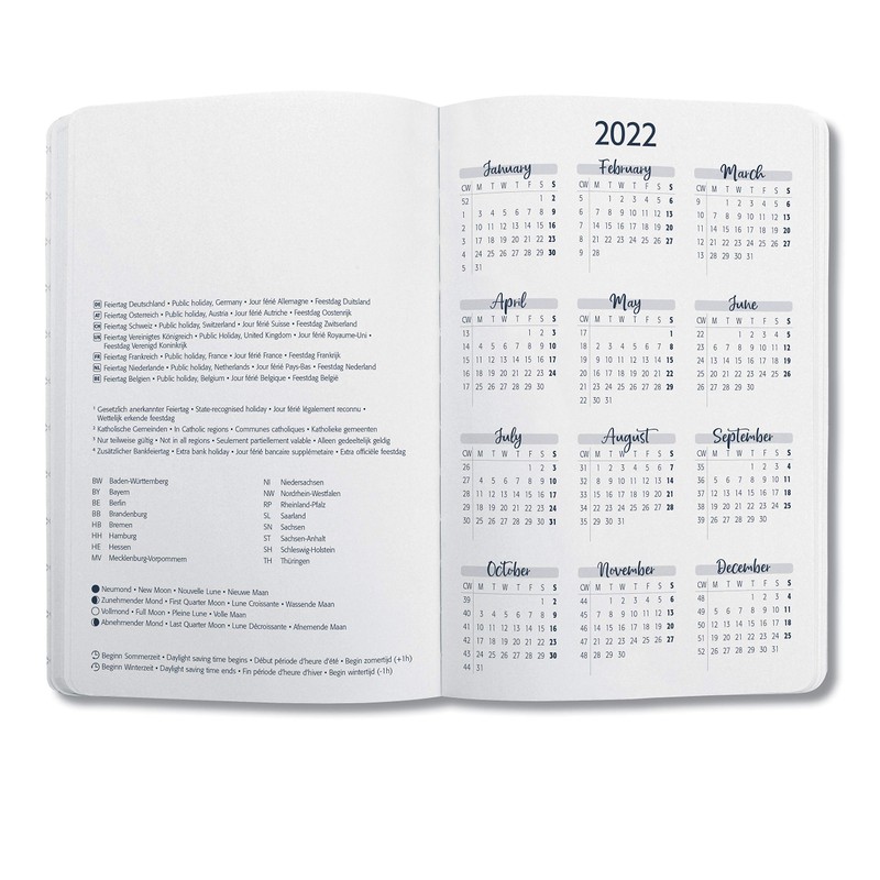 • White paper (80 g/m², FSC certified), printed in elegant grey. Numerous information, design and planning pages: Monthly and year overviews, holidays and public holidays (DE/AT/CH/UK/FR/BE/NL), measurement chart, travel destinations, birthdays and much more. Many features: Elastic band closure, pen loop, slip pocket, ribbon bookmark, sticker sheet.