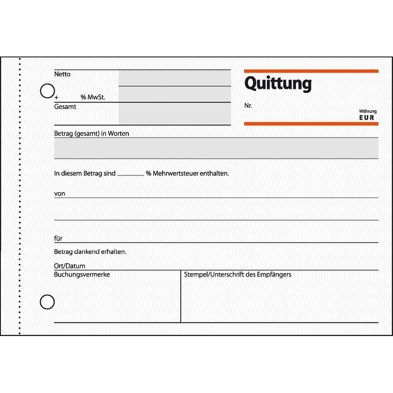 - Receipt form, format A6 landscape, with VAT proof, incl. 2 sheets of blue paper