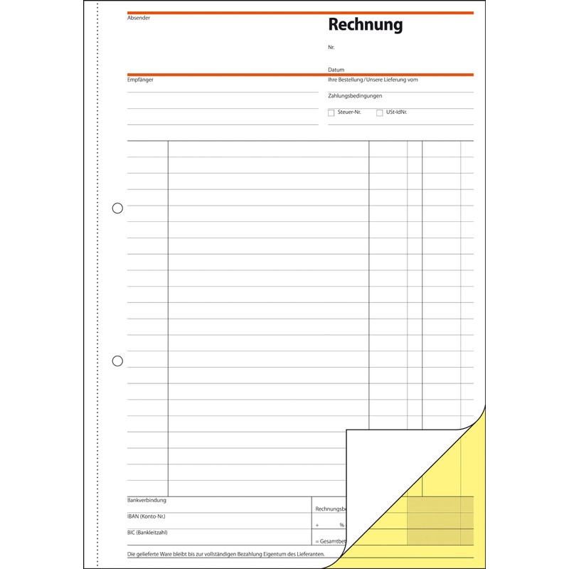 - Invoice book / invoice block according to the current legal situation with all necessary information such as tax number/VAT ID no. and invoice number