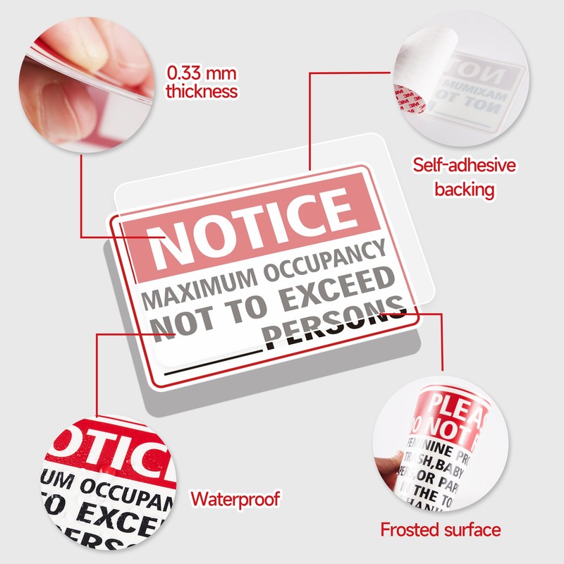 - Maximum Occupancy Sign is made of Plastic material with Adhesive Backing Sticker. This Occupancy Sign can be easily used outdoors for 7 years.