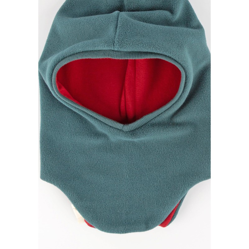- The hat is made of polar fleece in petrol and inner made of interlock in red