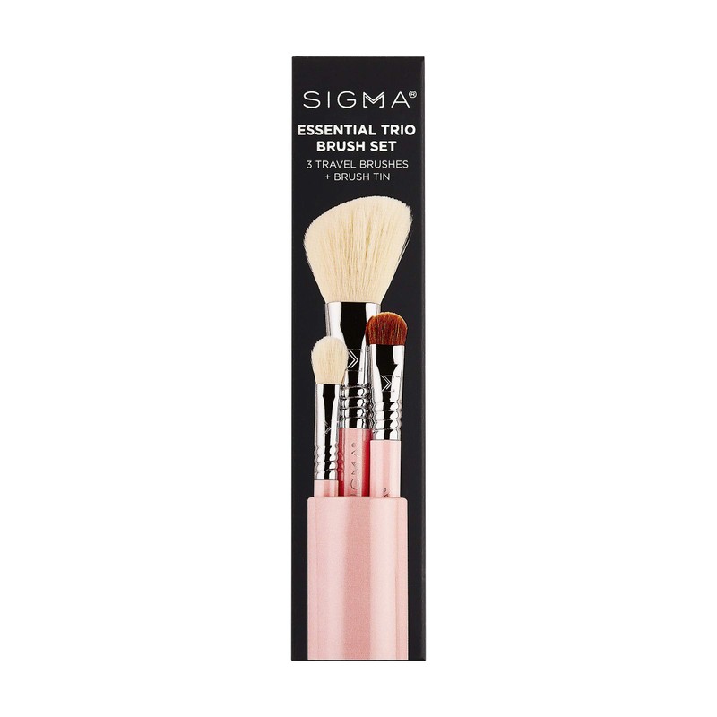 Sigma Beauty Travel Essential Trio - Juego de brochas de maquillaje para base de maquillaje en polvo, sombra de ojos, 3 cepillos de herramientas con soporte de lata, color rosa claro