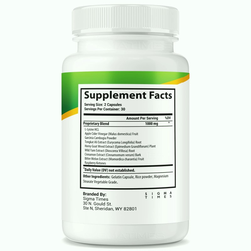 • Ingredients: Apple Cider Vinegar, Garcinia Cambogia, L-Lysine, Tongkat Ali (Eurycoma longifolia), Horny Goat Weed Extract, Wild Yam Extract, Cinnamon Extract, Bitter Melon Extract, Raspberry Ketones