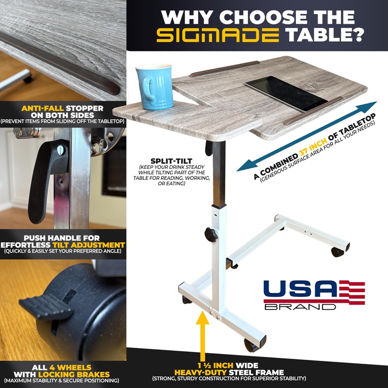 Experience superior convenience with the Sigmade split-tilt table on wheels. Whether used as a chairside table for a recliner, a lift chair table, or a wheelchair table, this multifunctional table provides exceptional mobility and comfort for young adults, seniors, or individuals with disabilities.