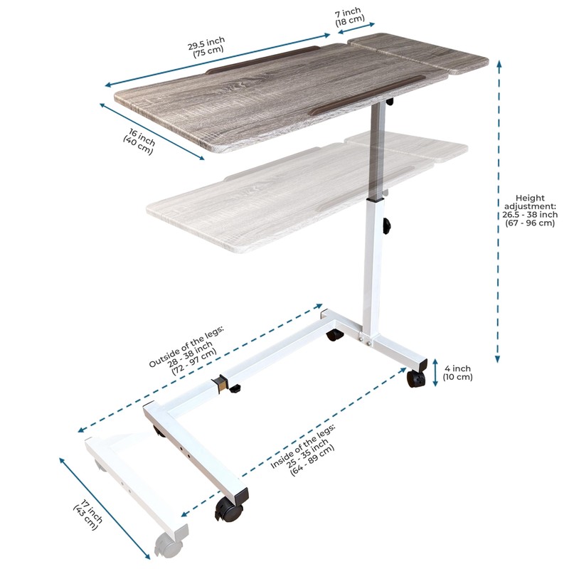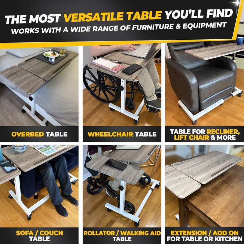 • Adjustable Width (25"-35") & Height (26.5"-38"): The only table with an adjustable width wide enough to serve as a recliner table, lift chair table, armchair table or wheelchair table. Its slide under design also make it an ideal overbed table or perfect for rolling under a sofa or couch. Offering exceptional versatility, this table is a must have mobility aid for young adults, seniors, and disabled individuals.