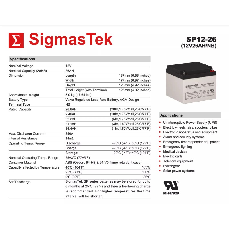 SigmasTek SP12-26 NB Battery Replacement Set for Mobility Manufacturing Coyote Wheelchair