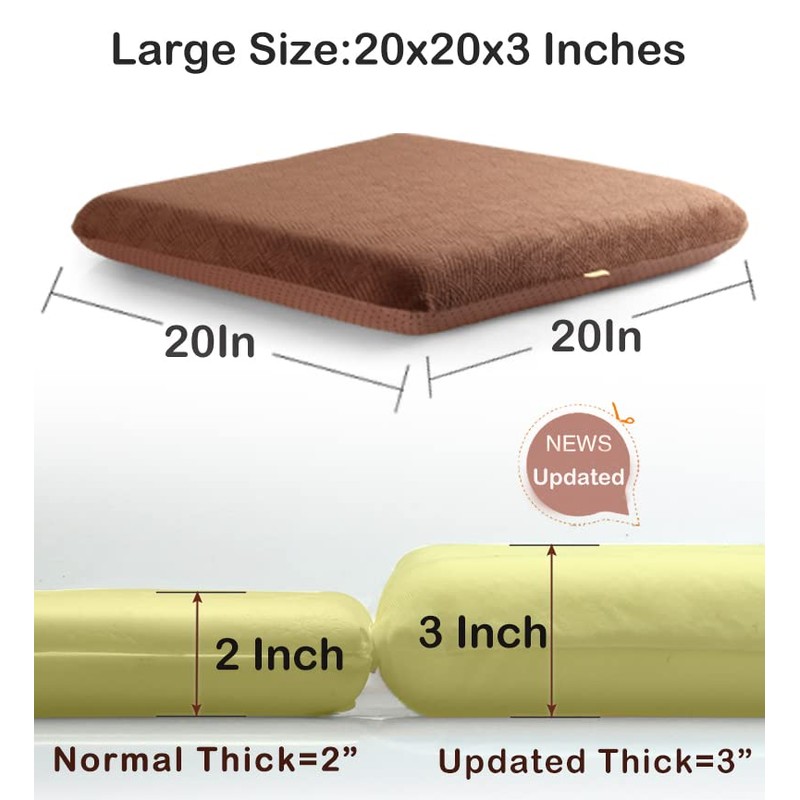 - Widely Used: Size:20x20x3 Inches. Adding comfort and height to your seat, Use our memory foam seat cushion on your recliner, car, armchair, couch, floor, rocking or gliding chair. This seat cushion also great for yoga, meditation, reading, knitting and relaxing.