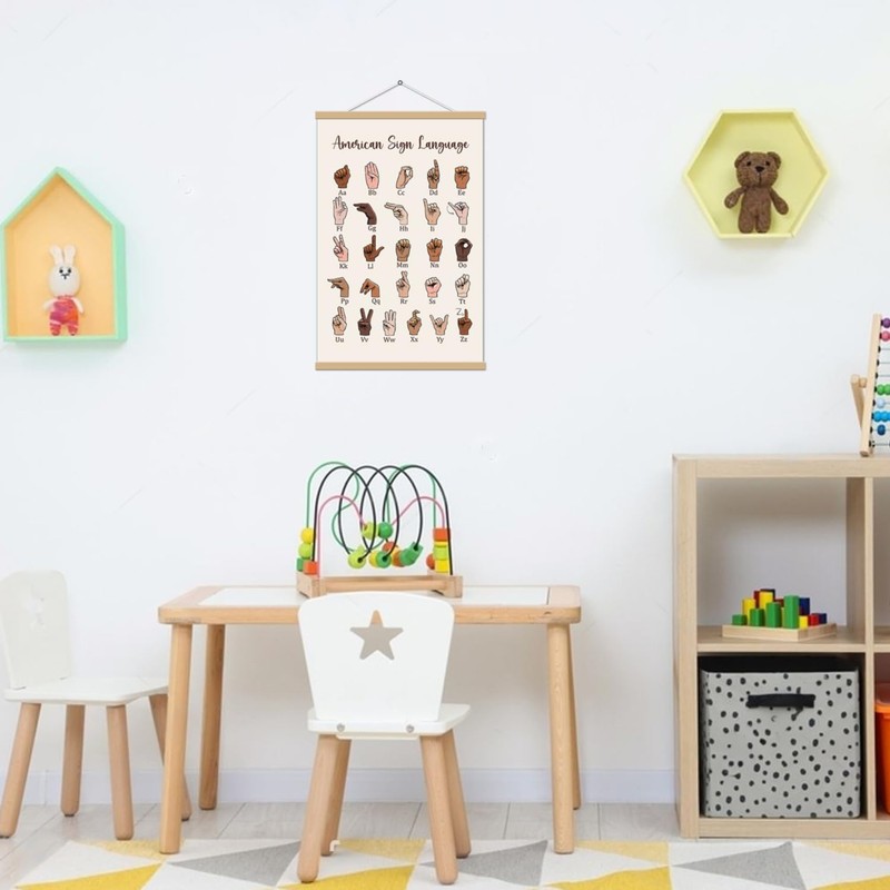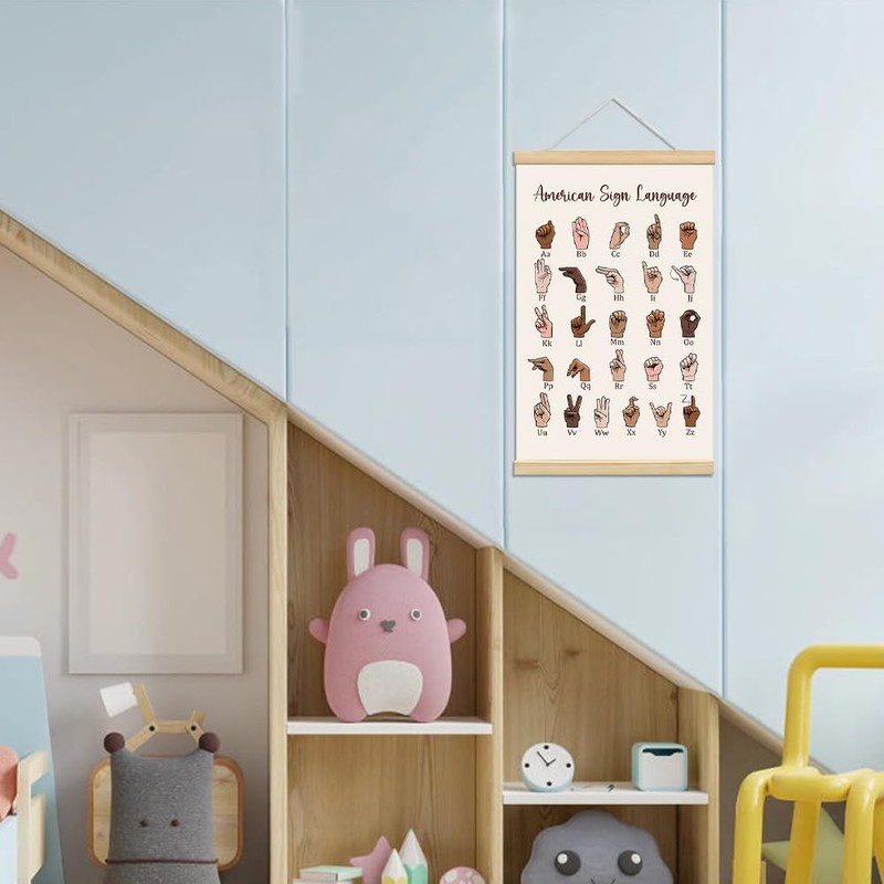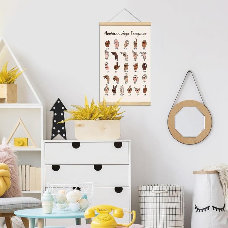 Sign Language Poster Hanger Framed, ASL Alphabet Canvas Print for Kids, Sign Language Alphabet Posters for Boho Classroom Decor, Educational, Back to School
